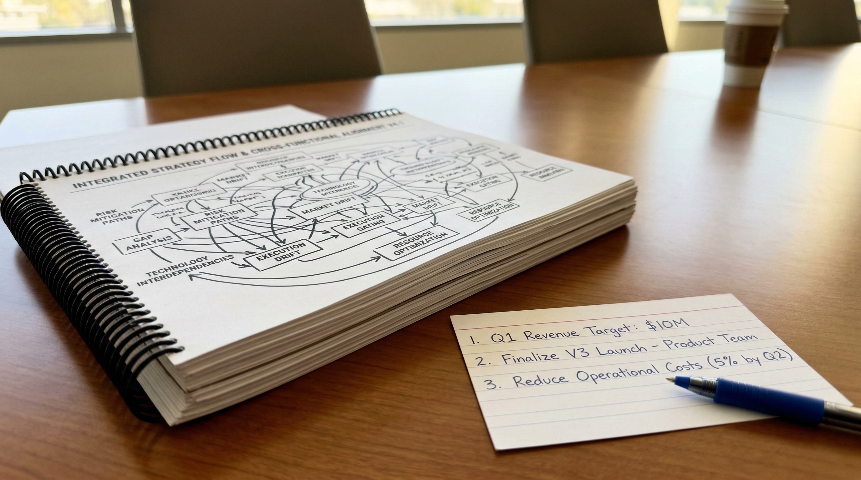 There is a certain type of strategy deck that every consultant has built and every executive has sat through. It is 60 to 80 slides long. It has a framework on slide 12 that introduces eight pillars. It has a matrix on slide 34 that maps capabilities to market segments. It has a roadmap on slide 57 that shows workstreams extending three years into the future with dependencies that no one will track.